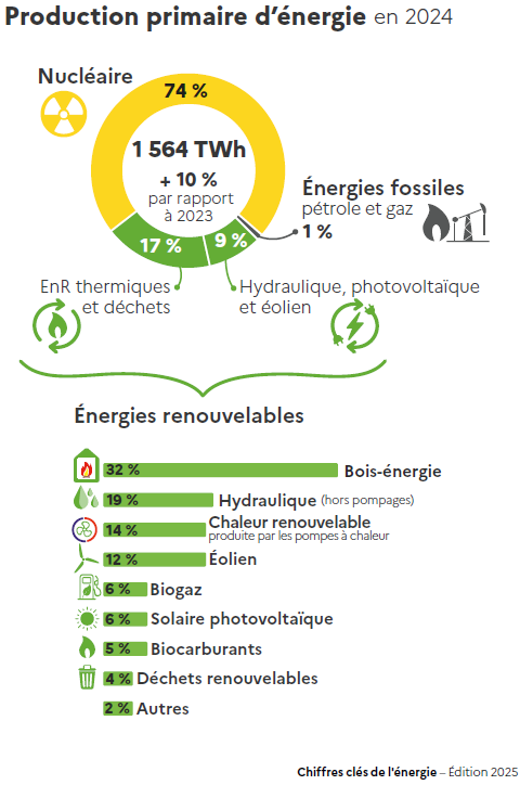 La #production #primaire d'#énergie en France continue de progresser en 2024 (+ 9,9 %) et retrouve son niveau d’avant 2022, année marquée par l’indisponibilité de plusieurs réacteurs nucléaires.