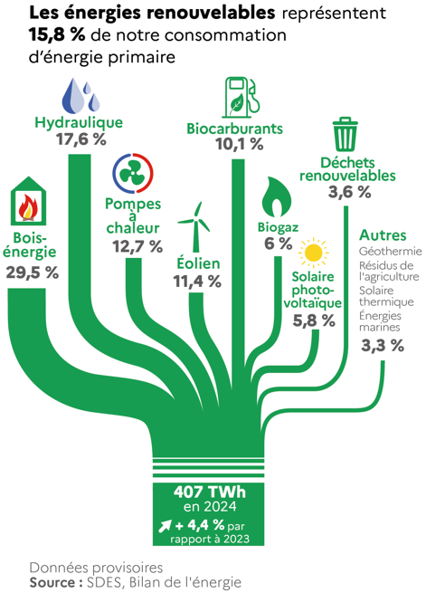 En 2024, le bois-énergie et l'hydraulique sont les premières sources d’#énergie #renouvelable en France mais l'éolien, le solaire photovoltaïque et les pompes à chaleur sont parmi celles qui progressent le plus ces dernières années.