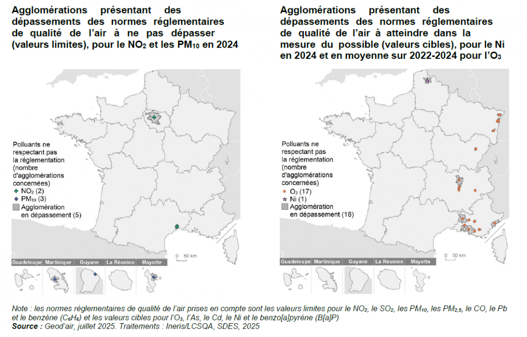 En 2024, 5 agglomérations dépassent les normes réglementaires pour le dioxyde d'azote (NO2) et les particules PM10, et 18 agglomérations les dépassent pour l'ozone (O3) et le nickel (Ni).
